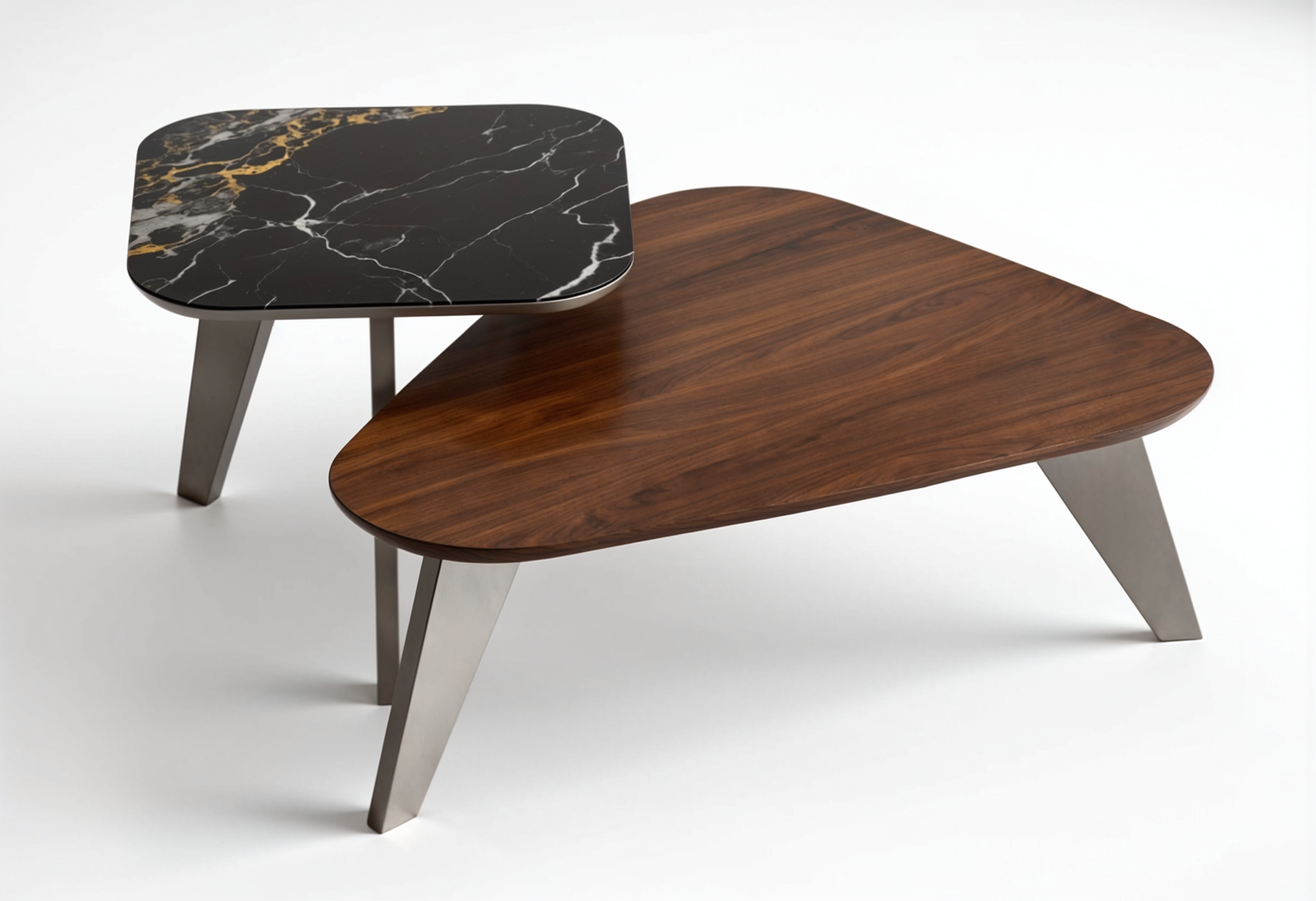 Um par de mesas de centro versáteis, lacadas, com detalhe de nogueira e cerâmica portoro mate de 3,5mm.