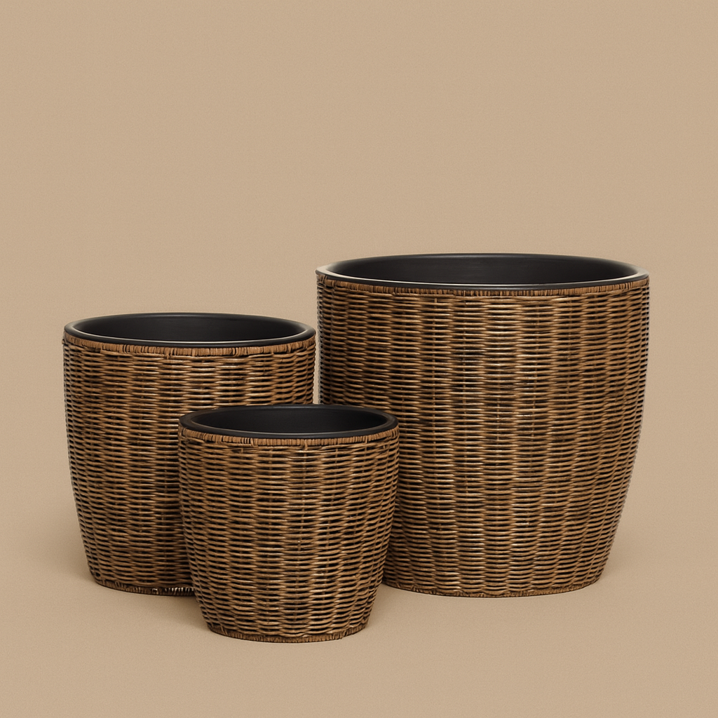 Com três tamanhos distintos, o conjunto adapta-se facilmente a diferentes tipos de plantas — desde espécies altas e exuberantes até plantas mais compactas. O interior em material resistente garante durabilidade, enquanto o exterior texturado acrescenta profundidade e conforto visual ao espaço.