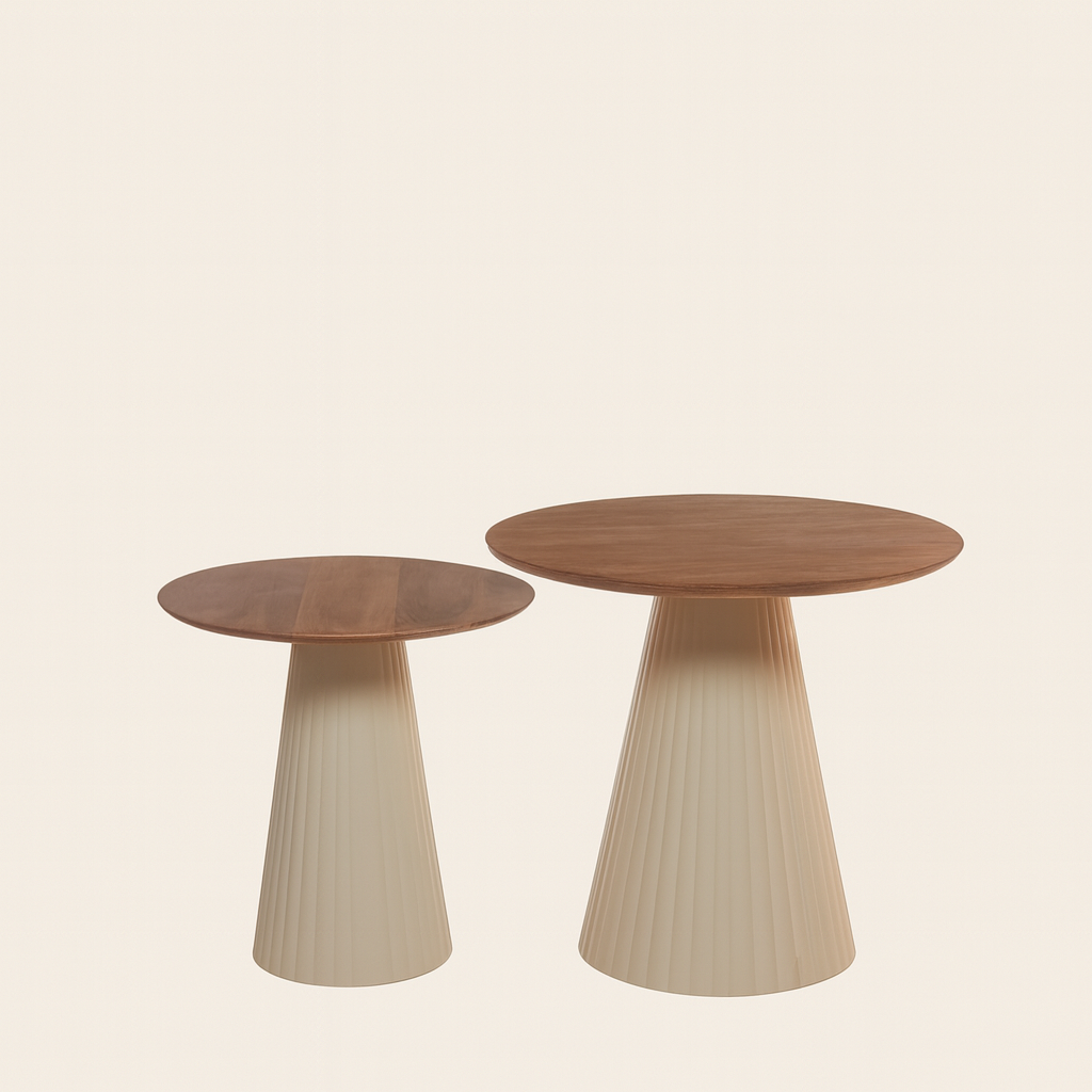 As bases texturizadas e o tampo em madeira criam um contraste elegante, perfeito para complementar salas modernas com funcionalidade e estilo.